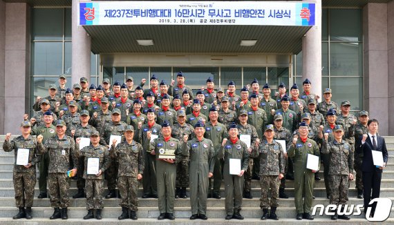 (원주=뉴스1) 노정은 기자 = 공군 제8전투비행단(이하 8전비)은 28일 237전투비행대대(이하 237대대)의 16만 시간 무사고 기록 시상식을 기지 강당에서 개최했다고 밝혔다.