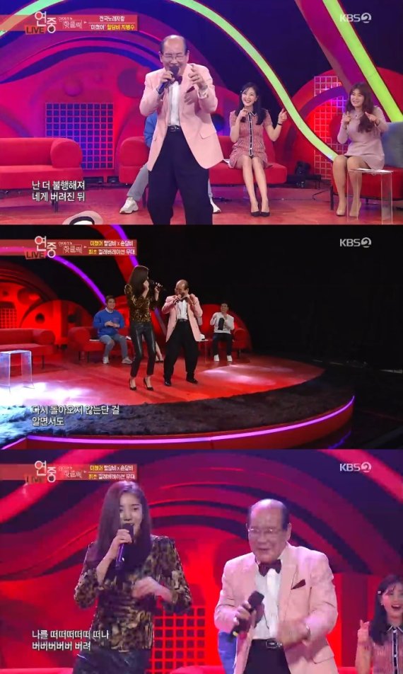 지병수 할아버지는 '연예가중계' 스튜디오에서도 같은 스타일로 노래와 춤을 보여줬다. 이때 손담비가 나타나 깜짝 컬래버레이션 무대로 훈훈함을 안겼다.
