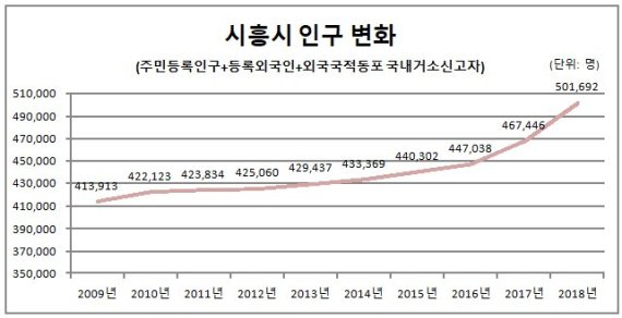 행정안전부가 발표한 ‘2018 인구통계’에 따르면, 2018년 시흥시 인구(등록외국인, 외국국적동포 국내거소신고자 미포함)는 2017년보다 2만9023명이 증가하며 인구증가율 전국 4위를 기록했다.