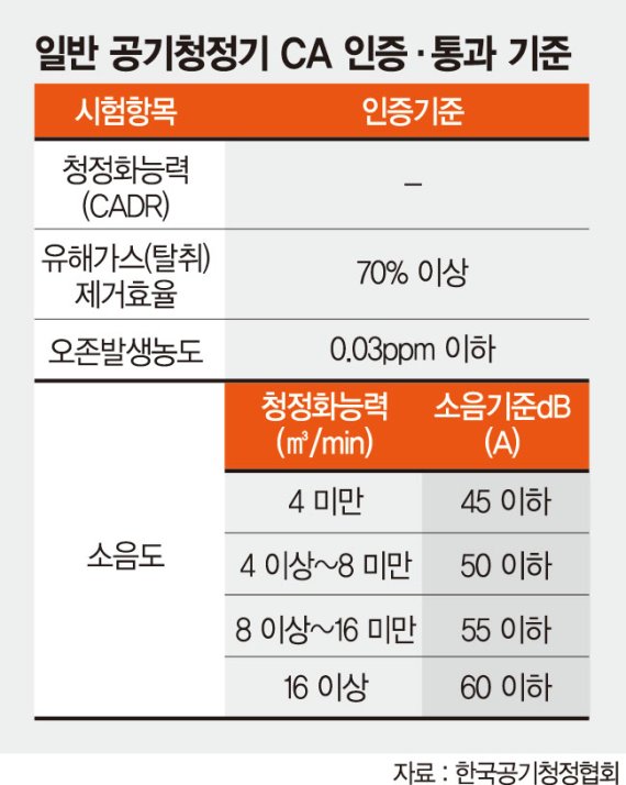 CA 인증은 소비자들이 제품의 성능에 대해 객관적인 판단 척도를 제공하기 위해 생겼다. 대부분의 업체들이 자사 기준에 따라 성능을 측정하고 소비자에게 제시하기 때문이다. 한국공기청정협회는 소형 공기청정기의 경우 청정화능력, 오존발생농도, 소음도 측면에서 객관적인 단체표준을 제작해 CA 인증을 부여한다. 구체적인 성능이 제시되지 않은 제품이라도 CA 인증을 받았다면 한국공기청정협회가 규정한 단체표준을 통과했다고 해석할 수 있는 것이다. 국내 가전업계는 한국공기청정협회이 까다로운 통과 기준을 제시하고 있다고 입을 모은다. 소형 공기청정기의 경우 청정화능력이 0.1~1.6㎥/분에 달해야 한다. 그러면서도 오존발생농도는 0.03ppm 이하, 소음도는 40dB 이하를 유지해야 한다. 대형 공기청정기의 경우 청정능력이 16㎥/분 이상, 유해가스 제거 효율은 70% 이상이어야 한다. 오존발생농도는 0.03ppm 이하, 소음도는 60dB 이하여야 한다.