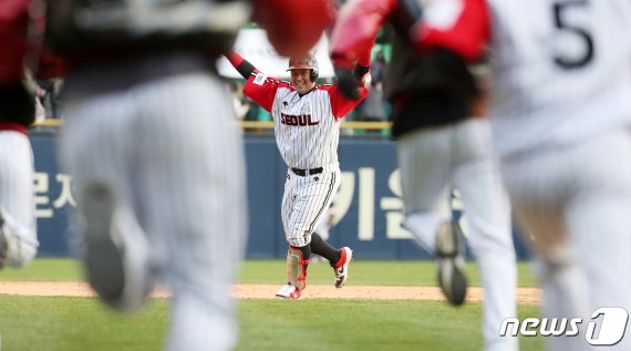 (서울=뉴스1) 정명의 기자 = LG 트윈스가 연장 10회말 터진 유강남의 끝내기 안타로 롯데 자이언츠에 극적인 역전승을 완성했다.