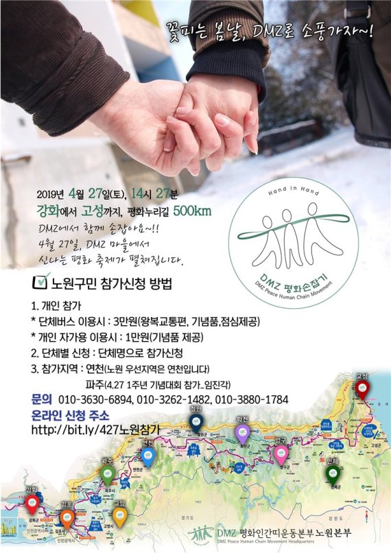 '꽃피는 봄날 디엠제트 소풍 가자’를 구호로 내건 이 운동은 이미 조성된 평화누리길을 따라 고성~인제~양구~화천~철원~연천~파주~고양~김포~강화까지 평화손잡기가 이어진다.