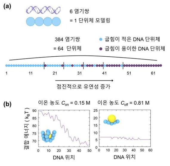 음전하의 DNA와 양전하의 나노입자는 정전기적 인력으로 결합한다. 이 때 DNA 구조가 유연할수록 나노입자와의 결합에너지가 낮고 결합하기 쉽다. 따라서 나노입자는 DNA의 유연한 부분을 향해 이동한다는 것이 확인됐다.