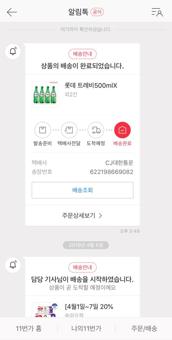 11번가는 '알림톡'을 통해 발송, 집하(택배사 전달 완료), 배송출발(담당 택배 영업소에서 배송출발), 오늘 도착예정시간, 배송완료 등 기본 배송정보를 채팅창으로 보여준다. 여기에 배송지연과 반품·교환 관련, Q&A·리뷰 관련, 항공권 가격변동 알림 등 각 주문 상품과 내용에 따라 총 43가지의 알림이 발송된다.