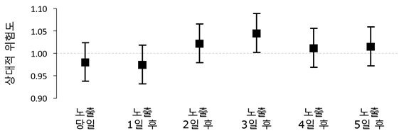 분석 결과 연구기간 동안 서울시의 일평균 초미세먼지(PM2.5) 농도는 25.0㎍/㎥였고, 미세먼지(PM10) 농도는 49.1㎍/㎥로 확인됐다. 특히 초미세먼지(PM2.5) 농도가 10㎍/㎥ 증가하면 3일 후 심방세동으로 인한 응급실 방문율이 4.5% 증가하는 것으로 밝혀졌다. 이외에 미세먼지, 아황산가스, 이산화질소, 일산화탄소, 오존 등은 심방세동 발생과 무관한 것으로 나타났다.