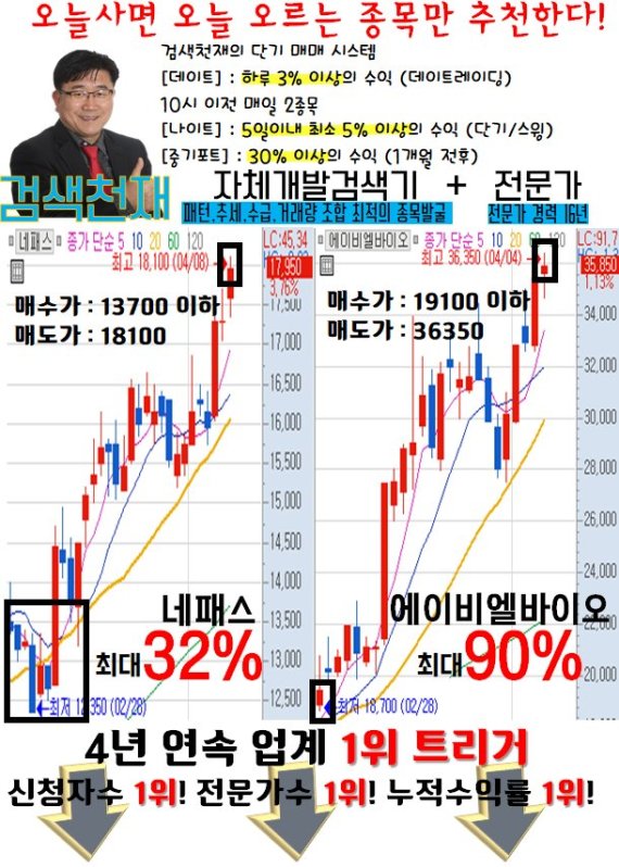 주식은 결국 분석! 패턴, 추세, 수급, 거래량을 자체 개발한 검색기가 분석해 단타에 최적화된 종목을 1차 발굴! 전문가 경력 16년의 노력함으로 2차 필터링! 절대적으로 오를 수밖에 없는 종목만 추천합니다. 손실 없는 투자! 검색 천재는 가능합니다. 믿기 어려우신가요? 오늘 단 하루만 무료로 카톡방을 공개하니 아래의 링크로 들어가 오늘 사고 오늘 수익 보는 종목을 확인해보세요.