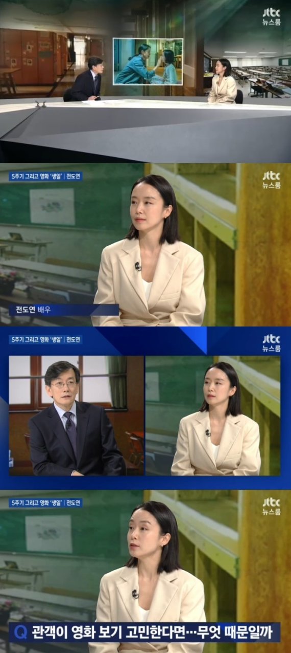 전도연은 15일 오후 방송된 JTBC 뉴스 프로그램 '뉴스룸' 문화초대석에 등장, 손석희 앵커와 만났다.