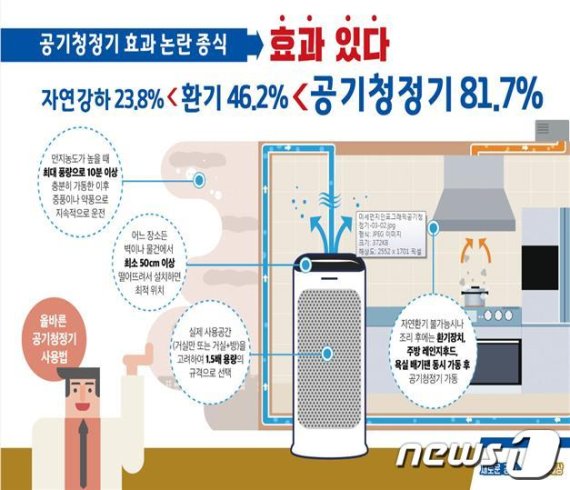 실험 결과 실내면적에 맞는 적정용량의 공기청정기를 가동할 경우 미세먼지 제거율은 81.7%로, 환기(46.2%)나 자연강하(23.8%)보다 미세먼지 제거 효율이 높은 것으로 나타났다.