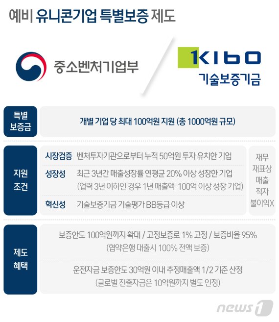 올해 첫 시행하는 1차 특별보증금은 1000억원 규모이며 '예비유니콘 기업'으로 선정된 15~20개 중소벤처기업은 각각 최대 100억원까지 보증 지원을 받게 된다.