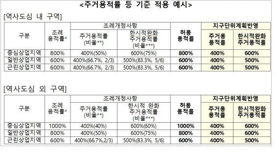 조례에서 정한 상업지역 용적률 대비 주거용적률 비율을 해당 지구단위계획의 허용용적률에 곱해서 주거용적률로 적용한다. 예컨대 일반상업지역에서 허용용적률이 800%인 구역은 주거 용적률 400%이하로 적용하고, 허용용적률이 600%인 구역은 주거용적률 300%이하로 적용한다.