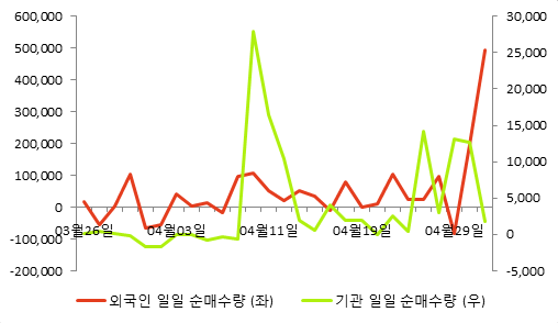 다음 표는 동종목의 외국인, 기관의 일별 순매수량을 나타낸 것이다.