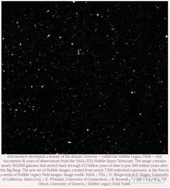 '허블 래거시 필드(HLF)'로 명명된 이 사진에는 태양계가 포함된 우리 은하계와 같은 은하 26만5000개가 포함돼 있다. 이 은하들 가운데는 지구에서 133억 광년 떨어진 은하의 모습도 포착돼 있다.