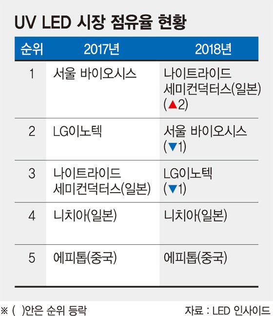 3일 LED 전문 시장조사업체 'LED 인사이드'에 따르면 지난 2017년까지 UV LED 시장의 1, 2위는 국내 업체들의 몫이었다.