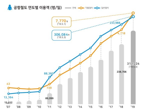 공항철도 관계자는 “고객들이 빠르고 편리한 공항철도의 장점을 체감하면서 해마다 이용객이 꾸준히 증가하고 있다”고 말했다.