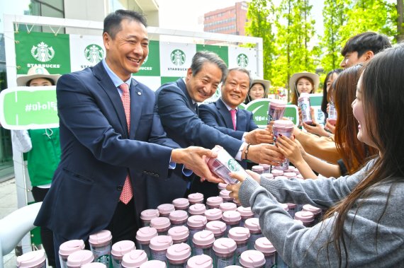 스타벅스커피 코리아와 환경부, 환경재단이 함께하는 '2019 마이 텀블러 캠페인'이 8일 오전 서울 종로 스타벅스 더종로 R점 앞 광장에서 열려 송호섭 스타벅스커피 코리아 대표이사, 박천규 환경부 차관, 최열 환경재단 이사장(왼쪽부터)이 시민들에게 텀블러를 나눠주고 있다. 사진=서동일 기자