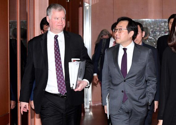 미국 북핵수석대표인 스븐브 비건 미 국무부 대북정책특별대표는 오전 강경화 외교부 장관 예방을 시작으로 한·미 워킹그룹회의를 했지만 결과 발표는 없었다.