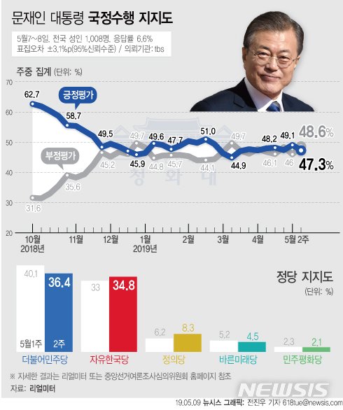 실제 리얼미터가 tbs의뢰로 지난 7~8일 이틀 동안 전국 19세 이상 유권자 1008명을 대상으로 조사해 9일 공개한 5월 2주차 주중집계(95% 신뢰 수준·표본오차 ±3.1%포인트·응답률 6.6%)에 따르면 전체 응답자의 36.4%가 민주당을 지지했으며 34.8%가 한국당을 지지한 것으로 조사됐다. 민주당은 30%대 중반으로 하락했으며 한국당은 4주 연속 상승세를 보였다.