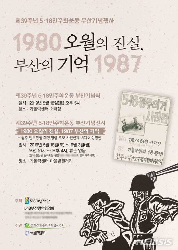 또 18일부터 6월 3일까지 가톨릭센터 마음밭갤러리에서 기념전시 '1980 오월의 진실 1987 부산의 기억-광주 민주항쟁 희생 영령 추모 사진전과 비디오 상영전'이 마련된다.