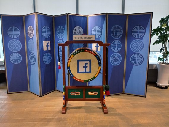 페이스북 코리아 사무실은 한국 문화를 강조하려는 시도를 많이한 모습이었다. 들어가는 문부터 전통기법의 나무로 짰다. 입구에는 페이스북 로고인 'f'가 가운데 박혀있는 우리나라 고유 악기 '북'이 눈에 띄었다. 그 뒤를 파란색 병풍이 둘러쌌다. 알파벳 'f'와 우리 문화가 의외로 잘 어우러졌다.