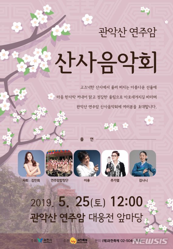 시가 주최하고 (재)과천축제가 주관하는 이번 음악회는 고즈넉한 산사에서 울려 퍼지는 아름다운 선율과 함께 싱그러운 초여름, 짙어가는 녹음 속에서 생동감 있는 분위기의 음악이 산사를 수놓는다