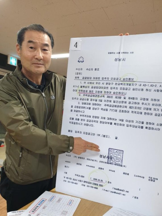 이날 이 회장은 성남시가 승인한 판교신도시 10년 공공임대주택 4개 단지 입주자 모집 공고문도 공개했다. 공고문에는 분양가상한제에 따라 책정된 주택 가격이 명시돼 있었다. 세대당 분양가는 80㎡형은 1억9000만원, 108㎡는 2억7000만원이었다. 실제 2006년 3월 성남시장이 건설사에 보낸 공문(주택과-5264호)을 보면 주택법 제38조에 의거 모집공고를 승인한다고 기재돼 있었다.