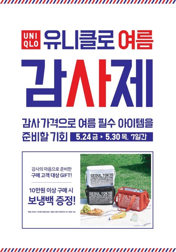 특히 에어리즘과 U크루넥 반팔 티셔츠는 이번이 시즌 첫 할인이다. 감사제 기간에 전국 매장과 온라인 스토어에서 10만원 이상 구매하는 고객 중 선착순으로 여름철에 유용한 보냉가방을 준다.