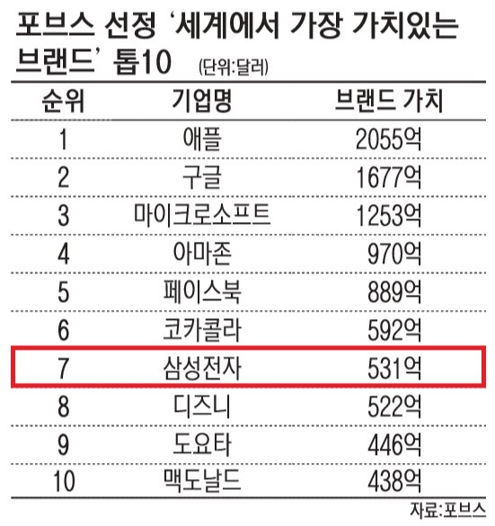 삼성전자가 미국의 경제전문지 포브스가 뽑은 '세계에서 가장 가치있는 브랜드' 7위로 선정됐다. 삼성전자의 브랜드 가치는 531억달러(약 63조3500억원)로 추산된다.