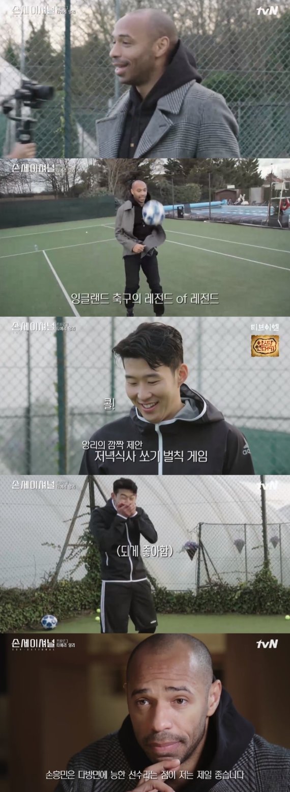 티에리 앙리는 손흥민에게 자신의 현란한 개인기를 알려주기도 하는 등 두 사람은 깊은 친분을 드러냈다. 테니스 공 트래핑으로 저녁 내기를 하게 된 두 사람. 이들은 승부욕을 발동시키는 모습으로 웃음을 자아냈다. 특히 손흥민은 티에리 앙리가 실책하자 환하게 웃는 모습으로 보는 이들을 폭소케 했다.