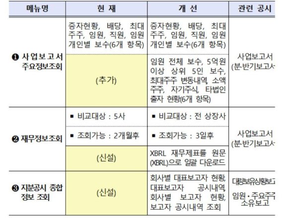 또 사업보고서상 재무제표를 이용가능한 재무데이터로 변환·제공하는 기간을 기존 (정기보고서 제출 후)2개월에서 3일로 단축하고, 비교대상 회사수도 기존 5개에서 상장법인 전체로 확대했다. 금감원 관계자는 "투자자가 원하는 기업정보를 추출해 비교·분석할 수 있는 환경을 제공함으로써 투자 의사결정 역량이 제고될 것"이라며 "상장법인의 지분변동 현황을 다양한 조건으로 조회할 수 있어 지분구조의 투명성을 높이는 등 투자정보로서 효용성도 제고할 것으로 기대한다"고 말했다.