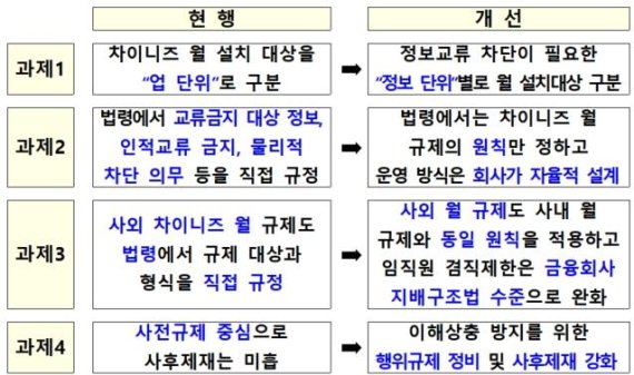 이에 따라 그동안 금융투자회사는 기업금융업무, 고유재산운용업무, 금융투자업 간에 차이니즈 월을 설치해 업무 단위로 칸막이를 세웠지만, 앞으로는 정보교류 차단이 필요한 정보 단위별로 규제를 받게 된다.