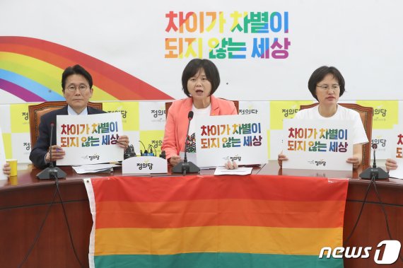(서울=뉴스1) 정상훈 기자 = 이정미 정의당 대표는 30일 서울광장에서 내달 1일 열리는 '퀴어문화축제'를 앞두고 "성평등이 우리의 헌법정신이며 세계인권선언을 비롯한 인권헌장이 지향하는 보편적 가치"라며 "정의당은 성소수자가 당당한 나라를 만드는 데 앞장설 것"이라고 밝혔다.