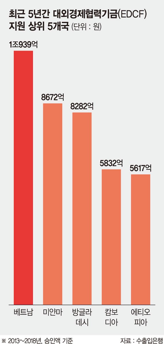 아시아 국가 중에서 EDCF 지원이 가장 많은 곳은 '베트남'이다. 최근 6년간 베트남에 1조939억원이 투입됐다.
