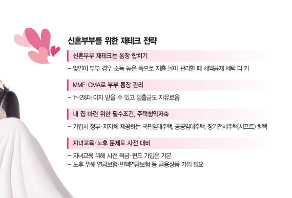 앞으로 탄생할 자녀를 위한 목돈 마련도 신혼부부가 미리 준비해야 할 과제다. 갑자기 급전이 필요할 경우를 대비한 적금과 펀드 가입도 기본이다. 적금은 중간에 해지해도 원금손실이 없으므로 안전자산으로 분류된다. 반면 펀드는 시장상황에 따라 원금손실도 있어 가입시 각별한 주의가 요구된다.