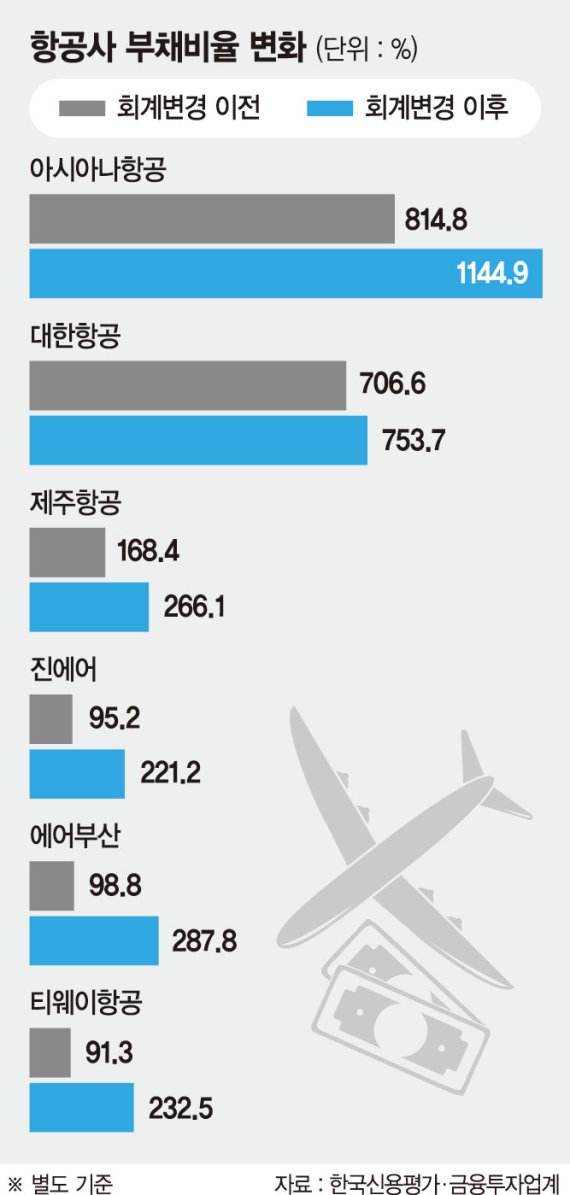 전문가들은 운용리스로 조달한 항공기 비중이 높은 아시아나항공과 저비용항공사(LCC)와 부채비율 상승폭이 컸다는 분석을 내놨다.