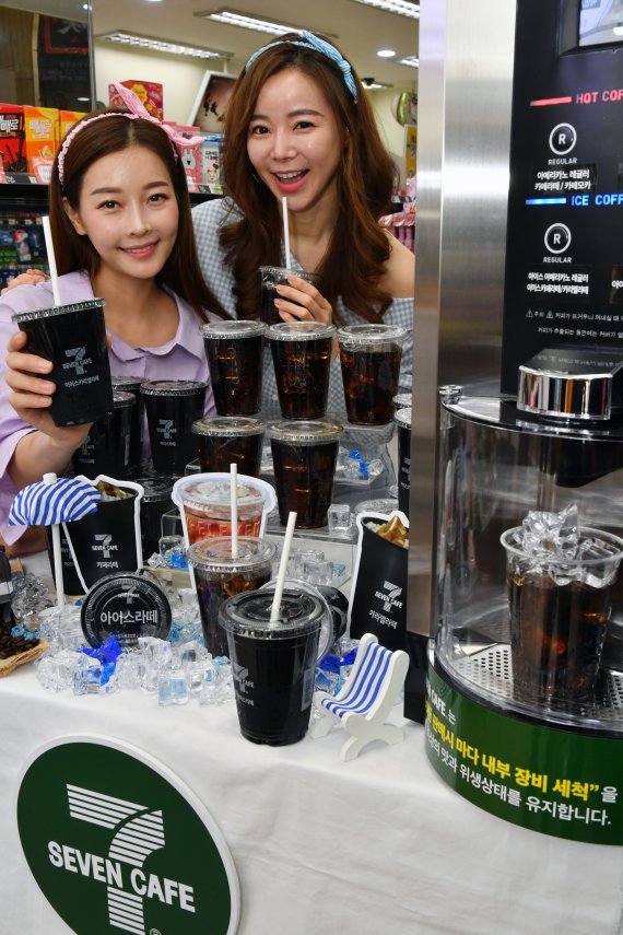 3일 오전 서울 소공로 세븐일레븐 소공점에서 홍보도우미들이 아이스 아메리카노, 아이스 카페라떼, 카라멜라떼 등 품질을 개선하고 새롭게 출시하는 아이스커피를 선보이고 있다.