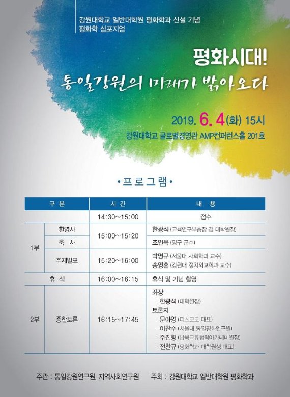 【춘천=서정욱 기자】강원대학교(총장 김헌영)는 오는 4일 글로벌경영관 AMP컨퍼런스홀에서 일반대학원 평화학과 신설 기념 ‘평화학 심포지엄’을 개최한다 고 3일 밝혔다.