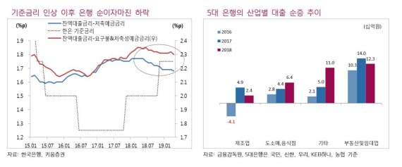 먼저, 기준금리 인하로 은행의 순이자 마진이 다소 개선될 것이라는 관측 때문이다. 서 연구원은 "지난해 11월 한국은행이 기준금리를 25bp 인상한데다 예대율 규제 강화로 조달금리는 상승하고 있는 반면 시중금리 하락으로 운용수익률이 하락하면서 예대금리차가 하락 추세를 보였다"며 "예전처럼 만기 미스매칭도 크지 않아 기준금리 하락으로 은행의 조달금리가 하락하면 예대금리차는 상당폭 개선될 것"으로 예상했다.