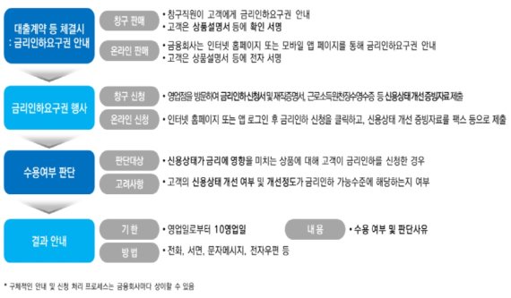 한편 이날부터 금리인하 요구권을 고객에게 고지하지 않은 금융회사 또는 금융회사 임직원에게는 기준금액 1000만원의 과태료를 부과한다. 또 금융회사는 금리인하 요구 신청을 받은 날부터 10영업일 내에 수용 여부와 사유를 신청자에게 전화·서면·문자메시지·이메일·팩스 등을 통해 안내해야 한다.