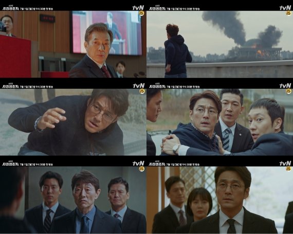 대통령 양진만(김갑수 분)의 눈동자에 비친 화염은 그가 있던 국회의사당이 폭파돼 불길에 휩싸인 상황을 보여준다. 연이어 “폭탄입니다!”라는 외침과 함께 국회에서 폭발물로 인한 테러가 발생했다는 뉴스 속보가 보도된다.