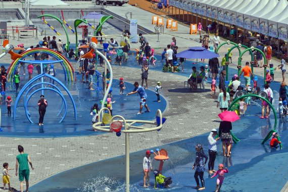 휴일인 23일 서울 중랑천 물놀이장을 찾은 어린들이 물놀이를 하며 즐거운 시간을 보내고 있다.