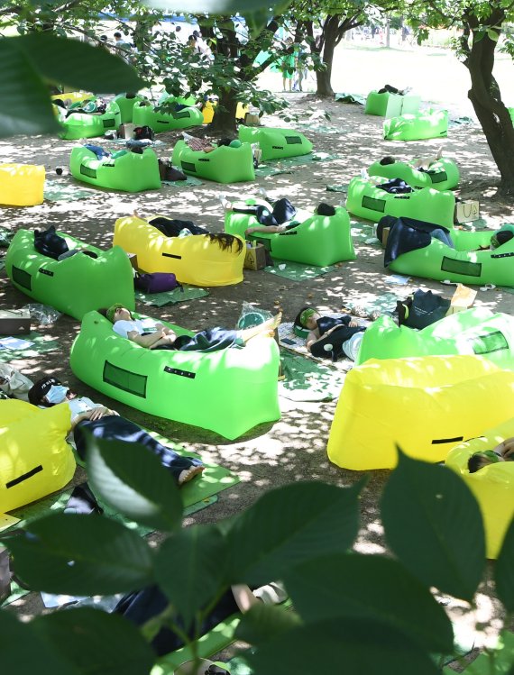 23일 서울 성동구 서울숲에서 열린 '우푸푸(우리강산 푸르게 푸르게) 숲속 꿀잠대회'에서 참가자들이 잠을 청하고 있다. 이번 대회는 취업준비와 학업, 아르바이트 등으로 잠 잘 시간이 부족한 청춘들을 위로하고 몸과 마음의 여유를 선사한다는 취지로 마련됐다. 사진=김범석 기자