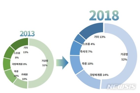 세분시장별 매출액은 2013년에는 가공밥>카레류>죽류>국·탕·찌개류 순이었지만 지난해에는 가공밥>국탕찌개류>죽류>즉석국 순으로 국물요리가 2위로 뛰어올랐다. 레토르트 카레는 순위에서 빠졌다.
