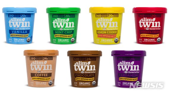 바닐라, 민트칩, 레몬쿠키, 쿠키앤크림, 커피, 초콜릿, 카다멈 등 7가지 맛으로 출시된 ‘쓰리트윈즈 슬림 트윈’은 저지방 우유와 크림 등 유기농 원료만을 사용해 만들었다. 샤베트 같은 식감, 깔끔한 뒷맛, 깊은 풍미 등이 특징이다.