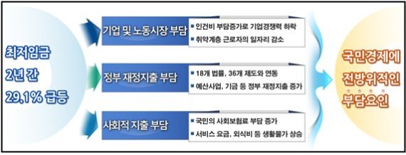 경총 측은 "최저임금의 나비효과적 인건비 상승에 따라 실물경제 부담이 가중되고 있다"면서 "최저임금과 연동된 일부 정부재정 사업의 지출이 최근 2년간의 상대적으로 큰 폭으로 증가하며 정부 재정에 부담으로 작용하고 있다"고 설명했다.