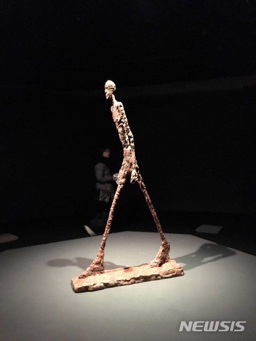 【서울=뉴시스】박현주 기자 = 검은 커텐을 제치고 들어서는 순간 숨이 막히는 전율이 온다. 쏟아지는 빛 조명속에 드러난 '걸어가는 사람'은 이 전시의 백미다.