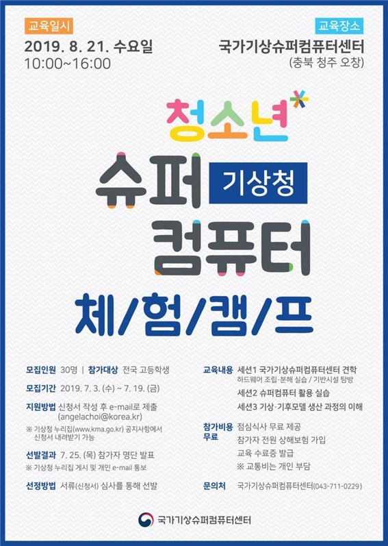 김종석 기상청장은 “이번 캠프에 참가하는 청소년들이 현장에서 직접 슈퍼컴퓨터를 체험하고 이를 통해 인공지능(AI), 빅데이터 등 유망 첨단기술 분야에 대한 꿈을 키우는 소중한 시간이 되길 기대한다”고 밝혔다
