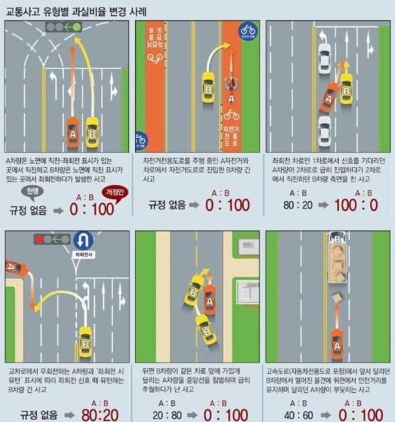 달라진 교통 상황도 반영된다. 자동차가 자전거 도로를 침범해 자전거와 부딪히면 100%, 회전 교차로에 진입하다 회전하던 차와 충돌하면 80% 과실비율이 적용된다.