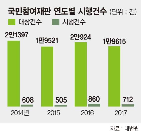 7일 법조계에 따르면 국민참여재판은 2008년 처음 시행한 후 해당 연도 시행률은 1.5%를 기록했다. 이후 가장 최근 집계된 수치인 2017년 기준 국민참여재판의 시행률은 여전히 1.5%로 10년째 답보상태다.