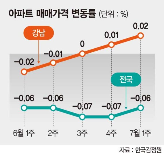 한국감정원에 따르면 지난 1일 기준 서울 아파트 매매가격 주간 변동률은 0.02%로 집계됐다. 감정원 통계에서 서울 아파트 가격이 직전 주보다 오른 것은 작년 11월 첫째주 이후 34주 만이다.