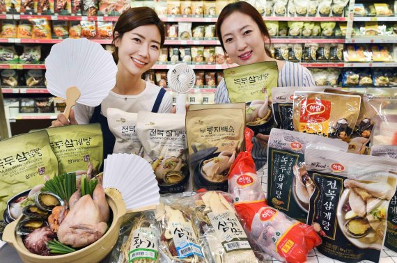 9일 서울 등촌동 홈플러스 강서점에서 모델들이 삼계탕 관련 상품을 선보이고 있다. 홈플러스는 초복(12일)을 맞아 신선 보양식품을 할인 판매한다고 밝혔다. 국내산 전복을 비롯해 민물장어, 낙지 등 수산물은 물론 대표 보양식품 삼계탕 재료인 생닭, 삼계재료 등을 저렴하게 판매한다. 또한 간편식 트렌드에 맞춰 13종의 삼계탕 간편식을 선보이며 2개 이상 구매하면 10% 할인 혜택을 제공한다.